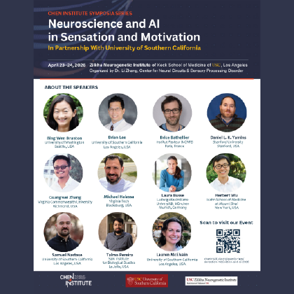 The 4th Annual Chen Institute-USC Symposia Series on Neuroscience and Artificial Intelligence in Sensation and Motivation will maintain its central focus on a fundamental question in systems neuroscience: How do brain circuits integrate external sensory inputs and internal states to generate motivated behavior? The meeting will convene leading investigators to examine the circuit, computational, and theoretical principles that underlie sensation and motivation. This year, the symposium will place expanded emphasis on the rapidly advancing interface between neuroscience and artificial intelligence.